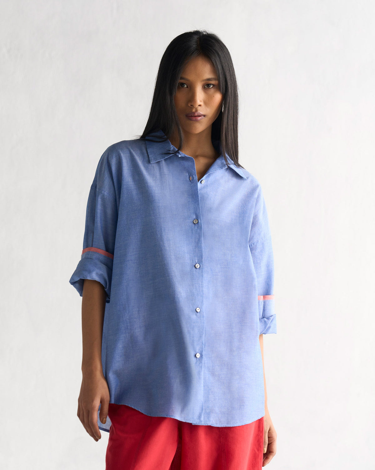 A staple on days you want to look chic without compromising on style. The Oversized Shirt in blue features red selvage detail on the seams of both the sides to add a pop of colour and texture to your outfit.