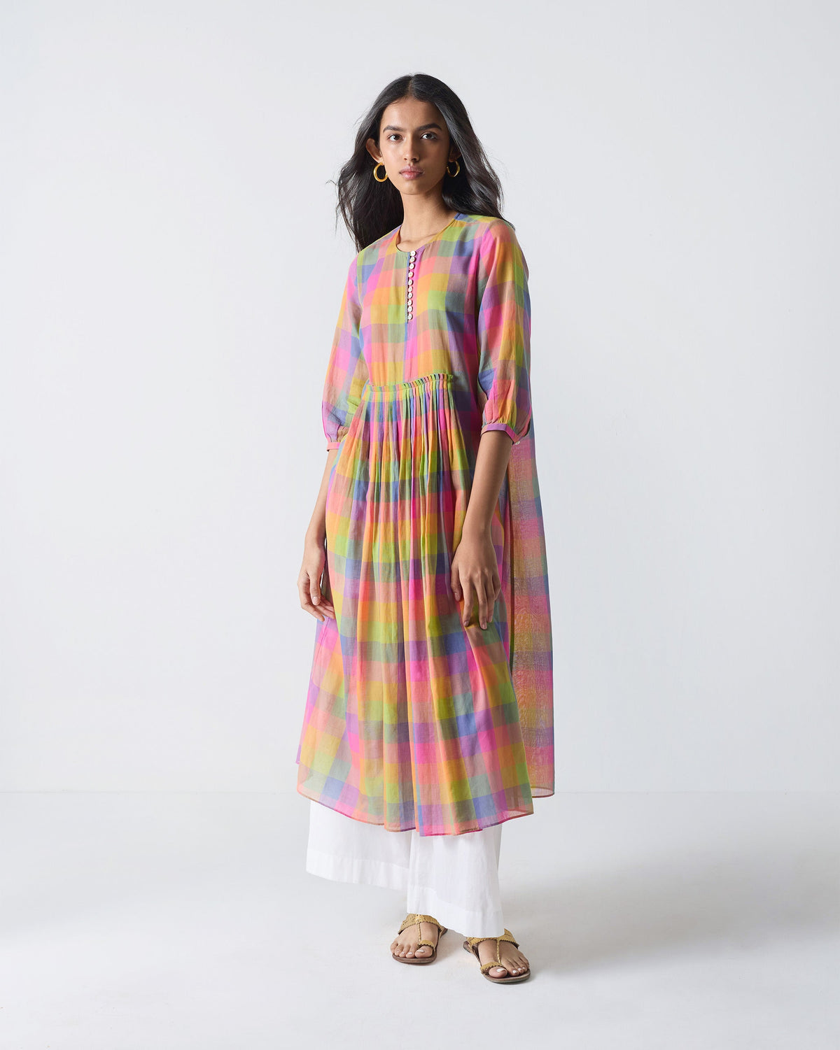 Crafted from 100% yarn-dyed cotton, this kurta features an overall multicolored disco check pattern. The pleated waist enhances the silhouette, creating a flattering shape while maintaining comfort and ease.