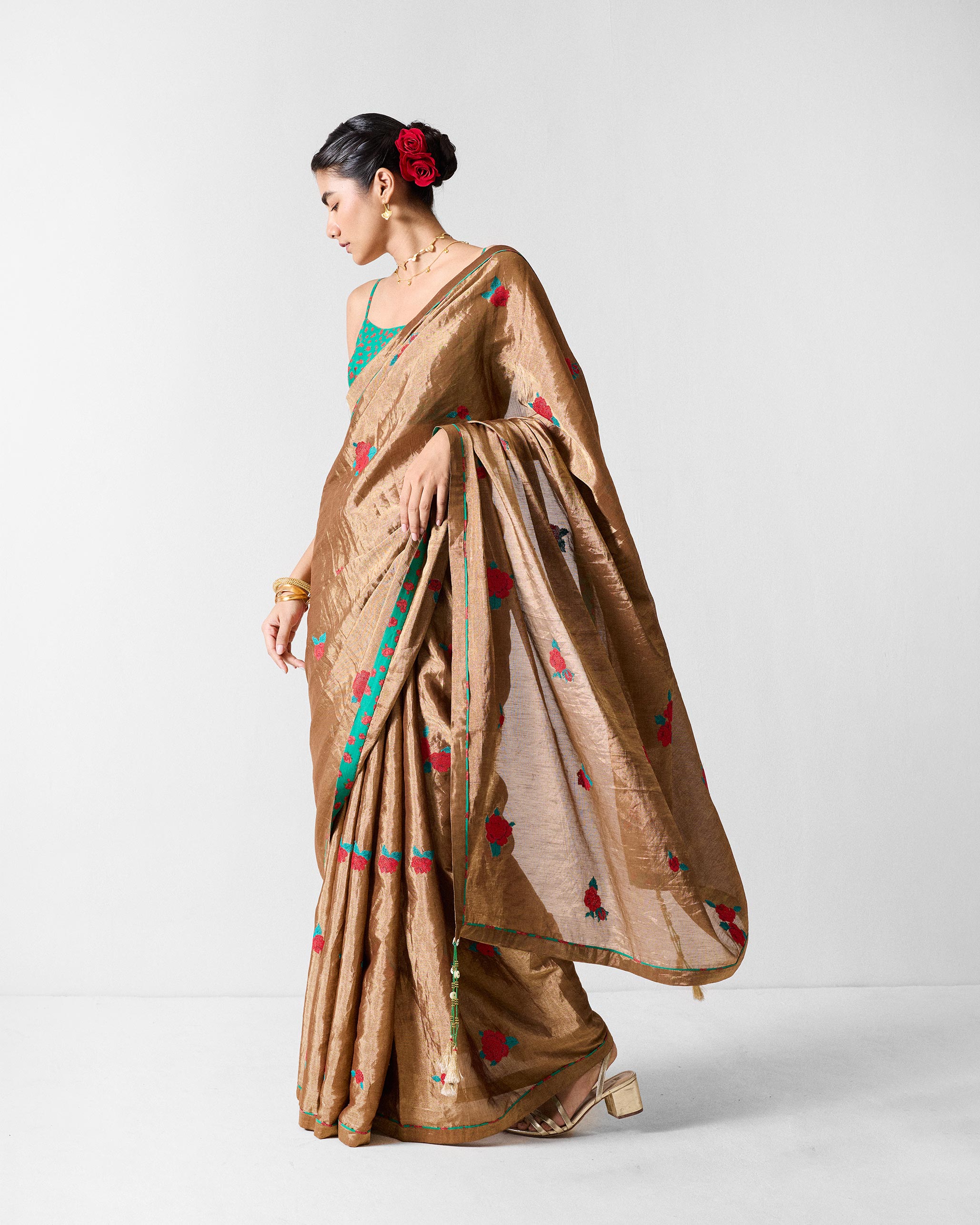 Whether styled with minimal gold jewellery for a sleek evening look or paired with heirloom pieces for a festive occasion, this sari shines bright.