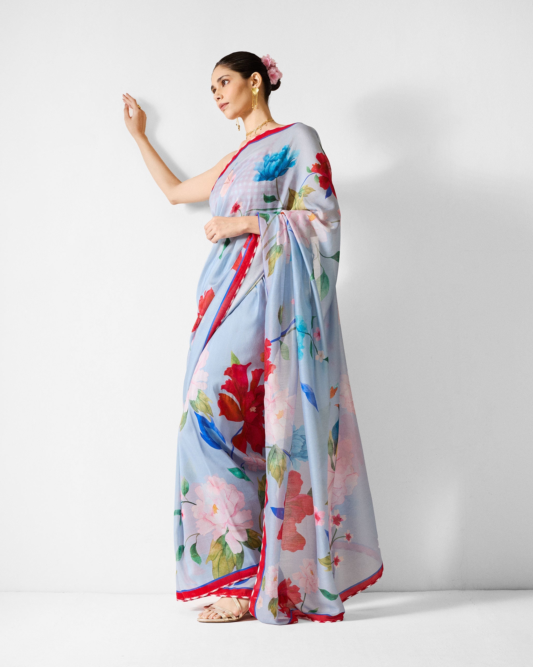 Softly poetic, the Roop Sari blends is woven from fine Chanderi — a lightweight cotton-silk blend known for its luminous finish. This sari features a serene light blue base adorned with an intricate oriental-inspired print.