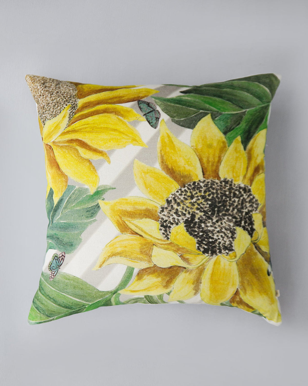 • Inspired by the bold illustrations that feature on the caravans of the gypsies, this cushion sports sunflowers in full bloom against a canvas of our signature stripes