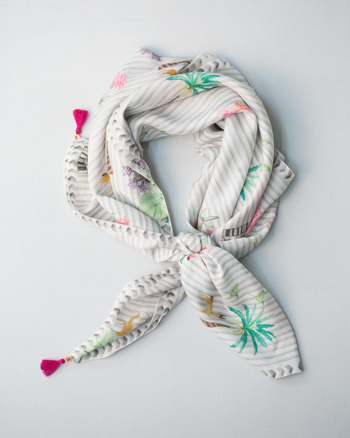 • Featuring a charming print that captures the essence of The Serai, Jaisalmer, this scarf is dotted with the region's local flora and fauna - palm trees, the desert rose, camels, and the chinkara or Indian gazelle