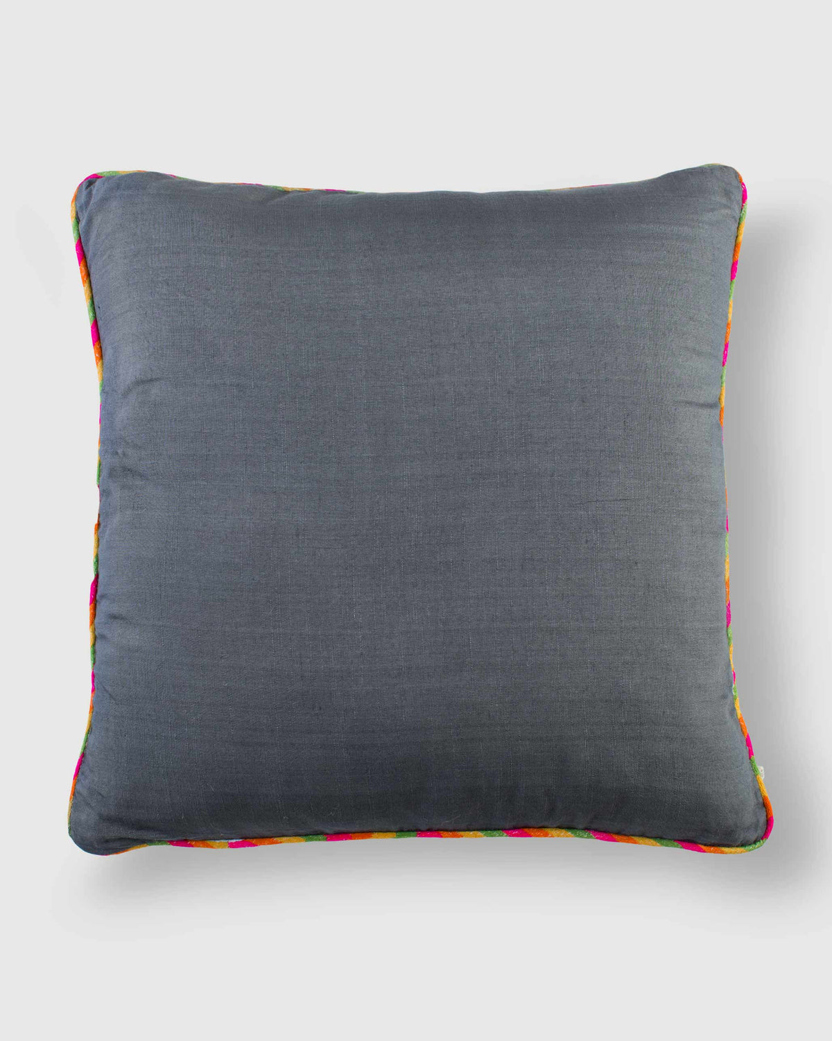 • This one comes in a silk blend, sorrounded by a merry multi-coloured border, and with a concealed zipper, this cushion lends a touch of class to your living room
