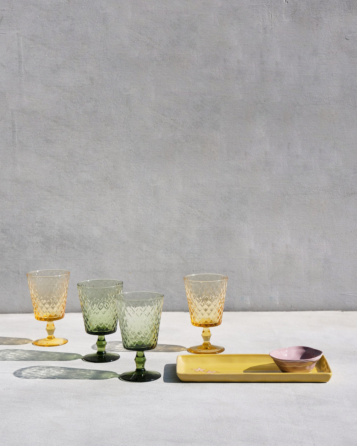 The set of 4 glasses is crafted with tinted glass in a contemporary design.