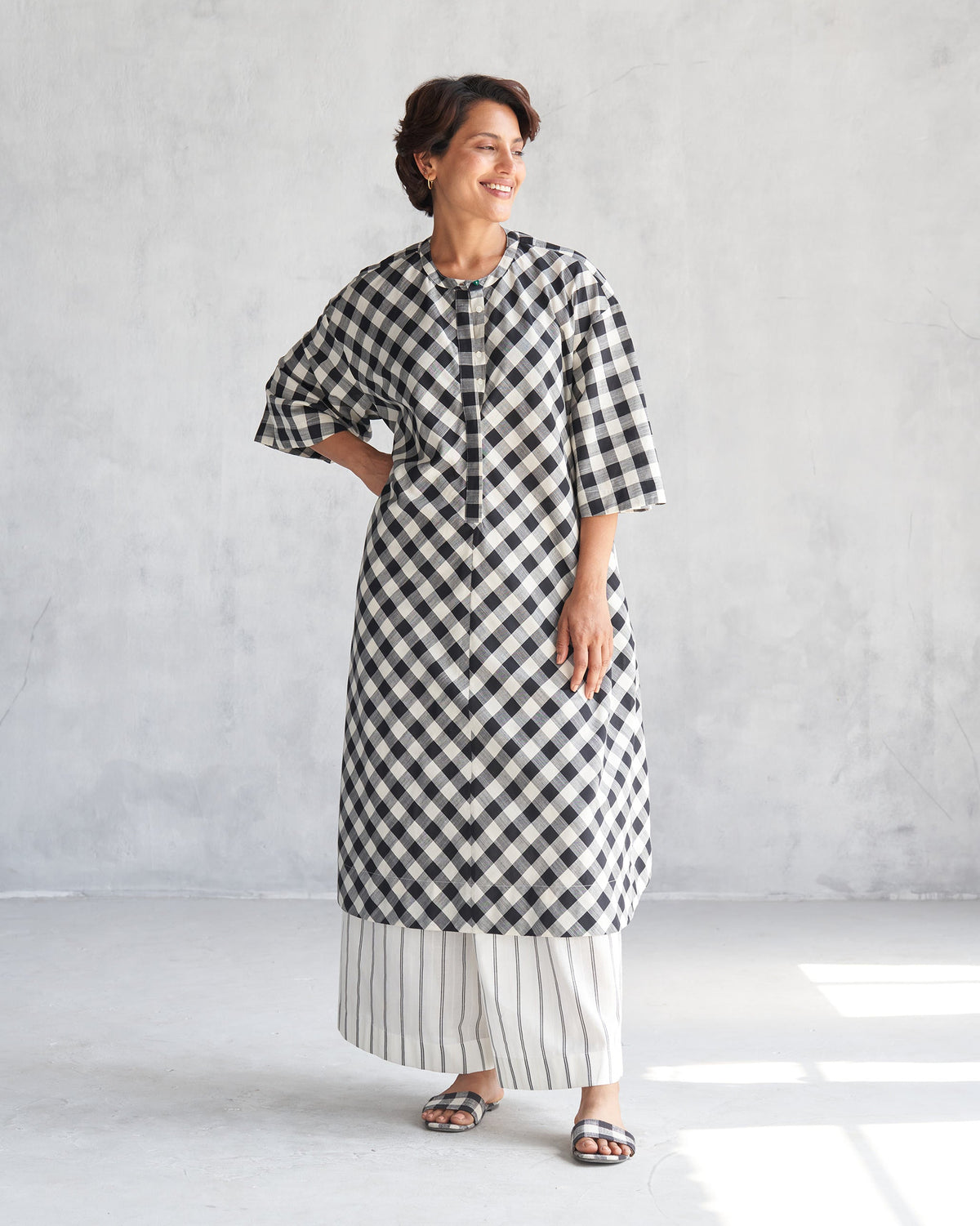 A flowy A-line kurta with a contemporary spin on the classic black & ivory checks, the Panelled Kurta is made for you to strut with ease and flair!