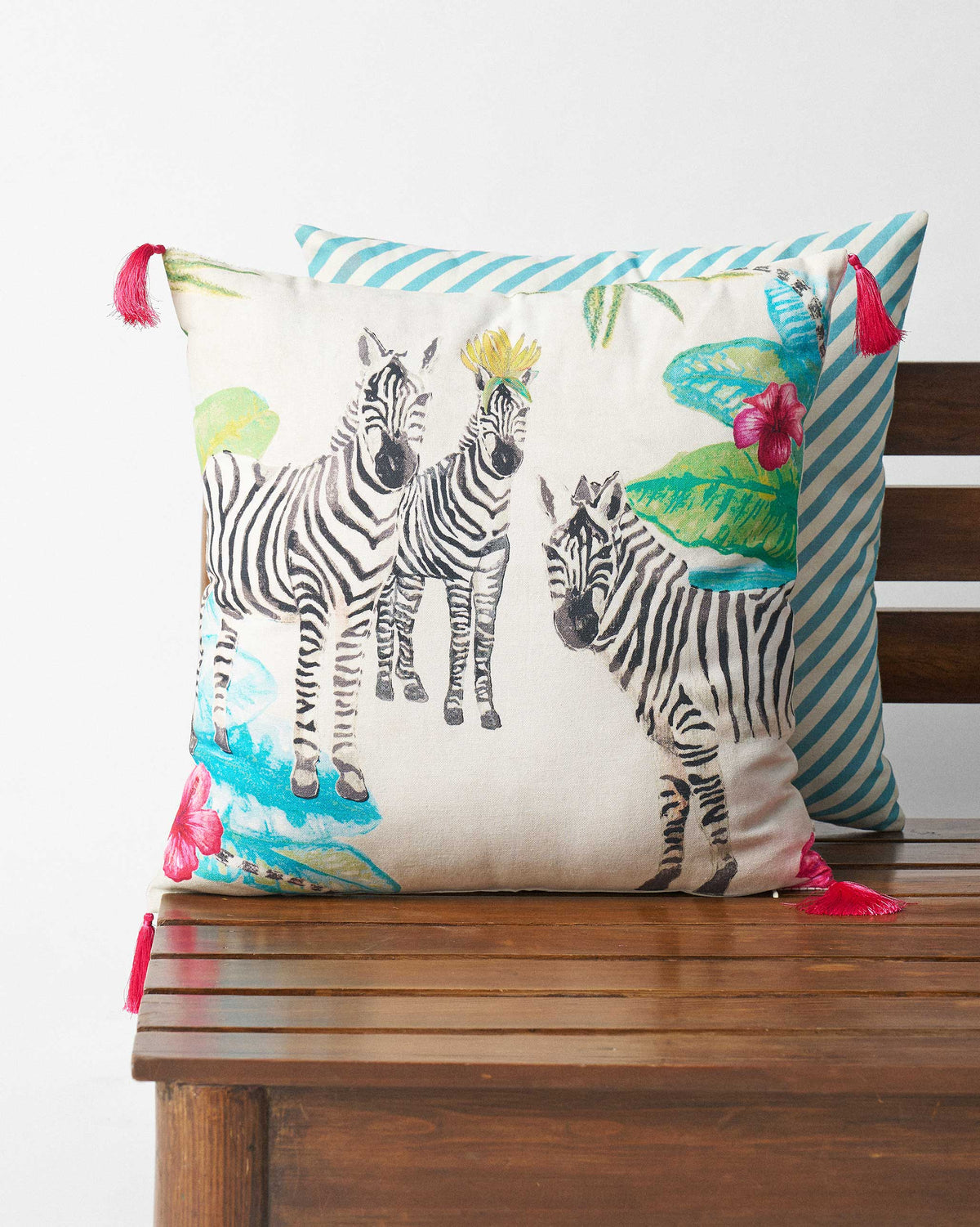 • In the Zeal Party Cushion Cover three zebras peek out from lush greens, as if caught mid-conversation in a Madagascan daydream.