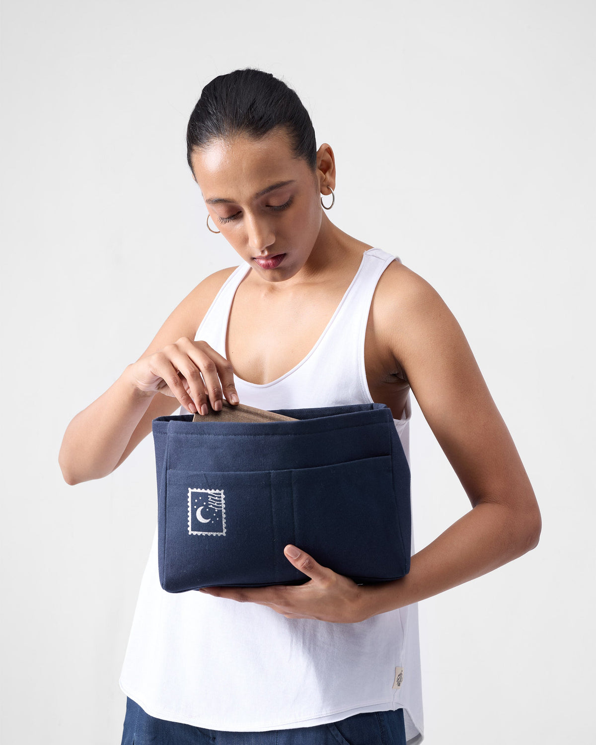 • Made from 100% cotton in navy, with a subtle star and moon stamp in the corner for a touch of whimsy.